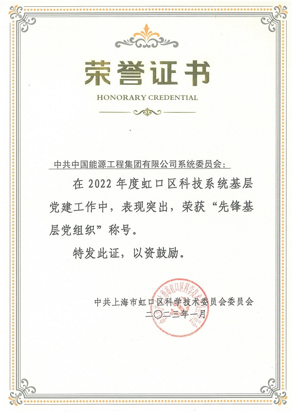 會(huì)議的最后,對(duì)虹口區(qū)科技系統(tǒng)基層黨建工作中表現(xiàn)突出的黨組織進(jìn)行了表彰,中國能源工程集團(tuán)有限公司系統(tǒng)黨委榮獲2022年度“先鋒基層黨組織”榮譽(yù)稱號(hào)。
